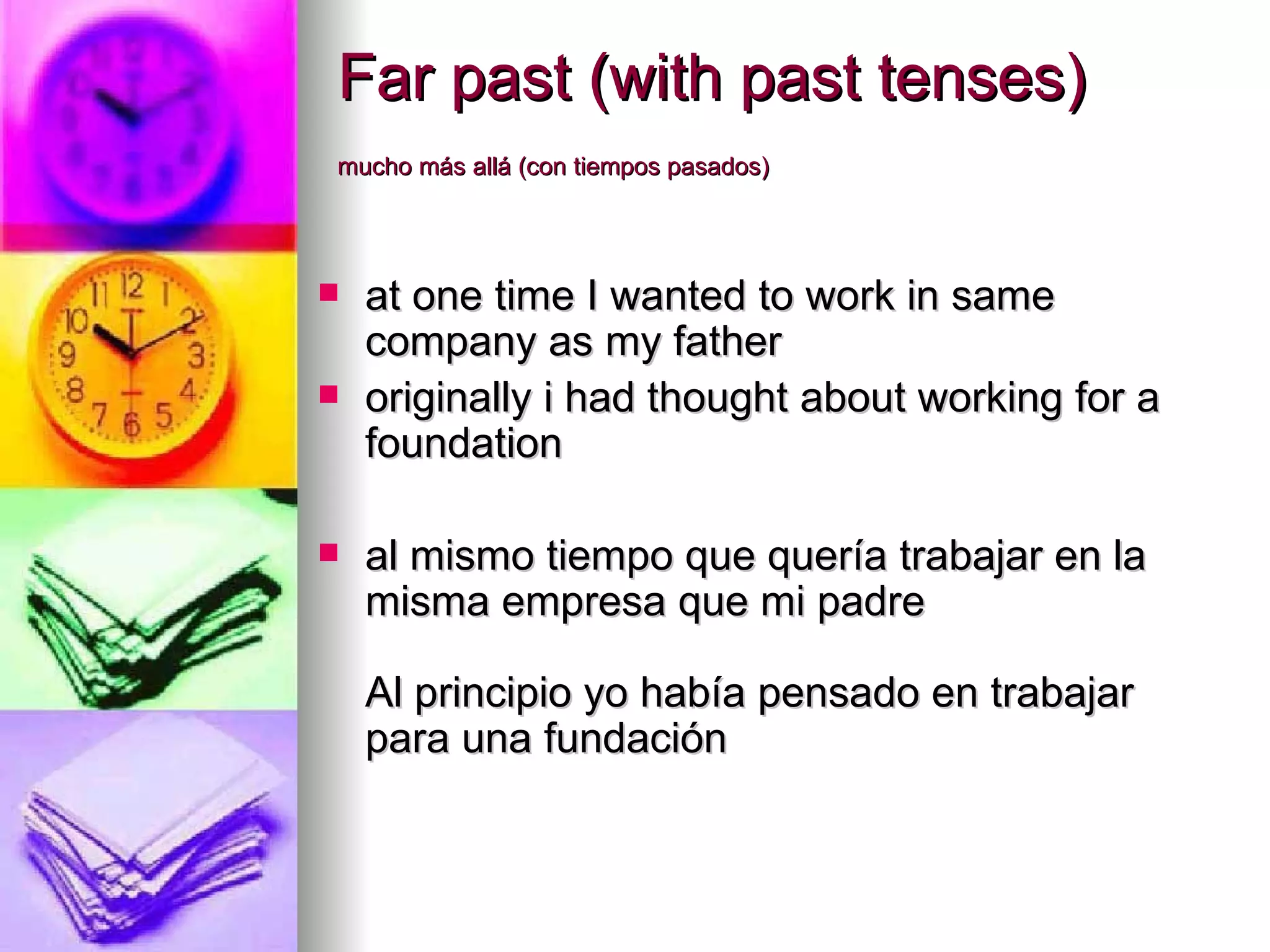 El documento discute diferentes usos del tiempo pasado y presente en inglés. Menciona que el pasado lejano se expresa con tiempos pasados, mientras que el pasado reciente se expresa con el presente perfecto. Luego, explica que el presente se expresa con tiempos presentes para describir acciones habituales, independientemente de si están ocurriendo en el momento. Finalmente, proporciona ejemplos de cómo enlazar oraciones usando conectores como "because", "despite", y "although".
