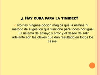 El documento trata sobre la timidez, un problema común que experimentan las personas en diferentes situaciones sociales. No existe una cura mágica para la timidez, sino que se requiere ensayo y error para superarla. Para vencer la timidez, es importante desarrollar habilidades conversacionales como tener temas de conversación preparados. Algunos temas comunes que se pueden usar son los planes, noticias y el clima. También se puede contarle a otros sobre la timidez para que comprendan mejor la situación. Existen diferentes tipos de timidez