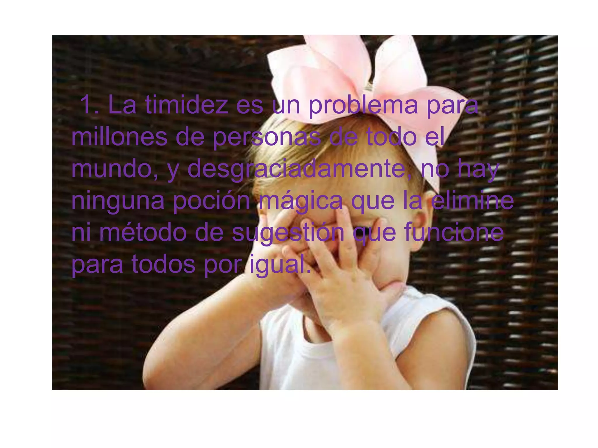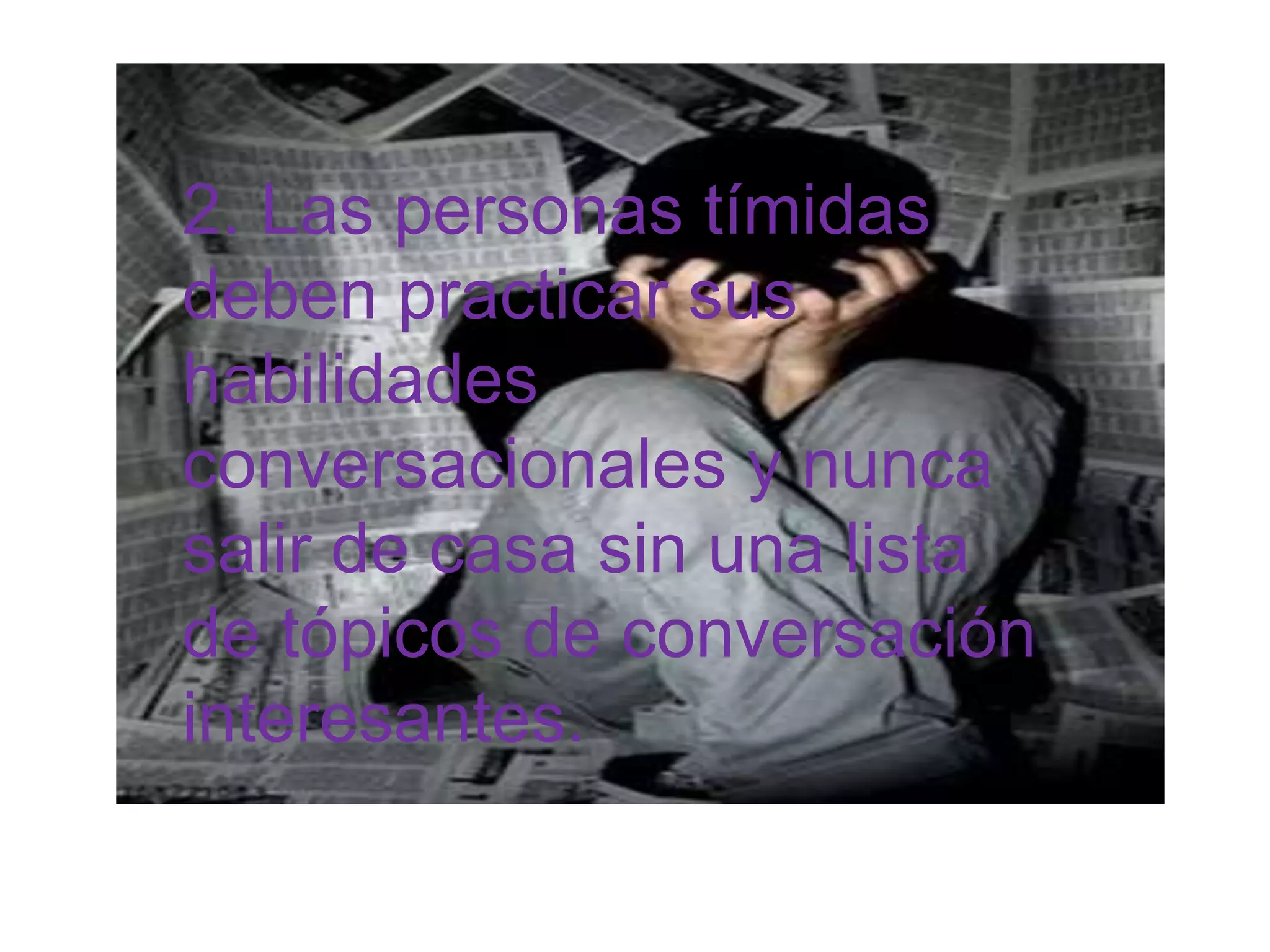 Este documento ofrece consejos para ayudar a personas tímidas a mejorar sus habilidades conversacionales, como practicar temas de conversación interesantes, preguntar sobre planes o actividades mencionadas previamente por otros, y explicar su timidez a los demás para obtener comprensión y apoyo. También recomienda recompensar pequeños logros a medida que se trabaja para superar la timidez.