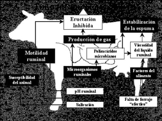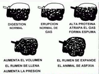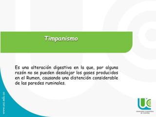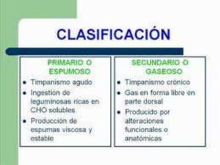 El timpanismo es una alteración digestiva en la que los gases producidos en el rumen no pueden desalojarse, causando una distensión de las paredes ruminales. Puede ser primario (espumoso) por sustancias espumantes o secundario (gaseoso) por mecanismos que alteran la eructación. Los signos incluyen cólico, distensión abdominal y dificultad respiratoria. El tratamiento implica desalojar el gas mediante sonda esofágica, romper burbujas con agentes tensioactivos o fistula rum