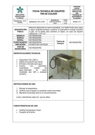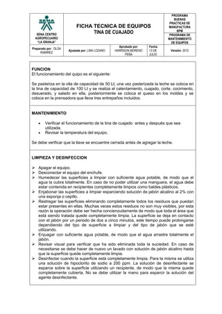Este documento describe una máquina de acero inoxidable con doble fondo para vapor o agua, que se utiliza para pasteurizar, cuajar, cortar, cocer, desuerar y salar la leche para producir queso. La máquina incluye un quemador y conexión a gas y tiene una capacidad de 100 a 200 litros. El documento proporciona instrucciones para el uso, mantenimiento, limpieza y desinfección de la máquina.