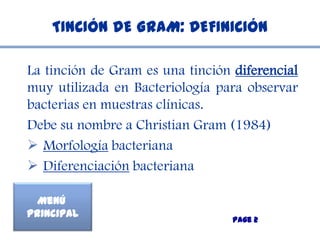 Este documento describe la tinción de Gram, una tinción diferencial utilizada para distinguir entre bacterias Gram positivas y Gram negativas. Explica que la tinción se basa en las diferencias en la pared celular, con las bacterias Gram positivas que retienen el colorante debido a su gruesa capa de peptidoglicano, mientras que las bacterias Gram negativas se decoloran debido a su capa más delgada. A continuación, detalla los pasos de la tinción, incluida la aplicación del colorante, el mordiente y el decolorante,