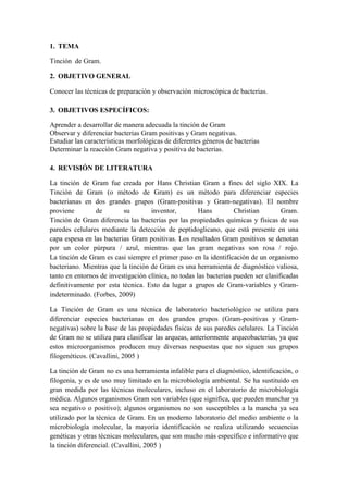 Este documento describe los procedimientos para realizar una tinción de Gram. La tinción de Gram es un método para diferenciar bacterias en dos grupos (Gram positivas y Gram negativas) basado en las propiedades de sus paredes celulares. El documento explica los pasos para realizar una tinción de Gram simple y una tinción de Gram compuesta, incluyendo la preparación de muestras, los reactivos utilizados y la interpretación de los resultados bajo el microscopio.