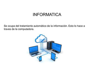 Este documento presenta una introducción a los conceptos básicos de informática. Explica que la informática se ocupa del procesamiento automático de información a través de computadoras. Define hardware como los componentes físicos de una computadora como la placa madre, microprocesador y memoria. Define software como los programas y datos no físicos. También describe periféricos comunes como monitores, teclados y discos duros y sus funciones de entrada, salida o ambas. Concluye que el hardware y software están relacionados.