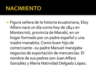 Eloy Alfaro fue un líder político ecuatoriano que lideró la Revolución Liberal entre 1895 y 1912. Uno de sus principales logros fue la separación entre la iglesia y el estado, estableciendo un sistema de educación pública laica. También impulsó importantes obras de infraestructura como el ferrocarril transandino. Sin embargo, su gobierno enfrentó resistencia por parte de los conservadores católicos y fue derrocado en 1911, siendo asesinado en 1912.