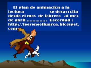 Este documento describe un plan de lectura para estudiantes de francés que involucra leer las aventuras de Tintín de Hergé durante el trimestre. Los estudiantes leerán diferentes libros de Tintín dependiendo de su nivel: principiantes leerán "Le crabe aux pinces d'or", intermedios "Le secret de la Licorne" y avanzados "Le trésor de Rackham le Rouge". Habrá concursos de marcapáginas, entradas de blog sobre las lecturas y videos grabando sus reacciones a los libros. El 23 de abril