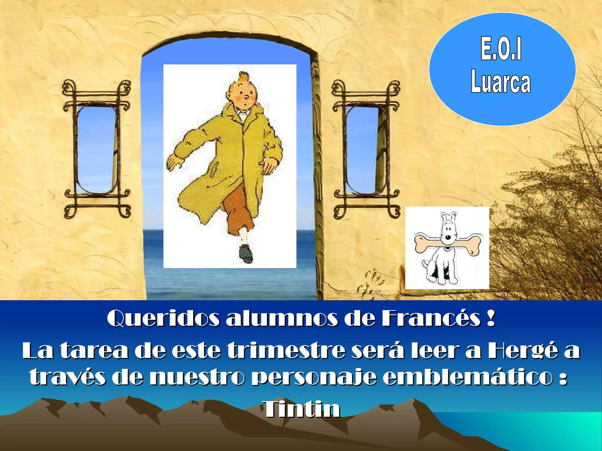 El documento presenta el plan de animación a la lectura para estudiantes de francés en el que leerán las aventuras de Tintín de Hergé. Los estudiantes de diferentes niveles leerán historias diferentes de Tintín. Habrá concursos de marcapáginas y de videos sobre las lecturas. El 23 de abril se celebrará el Día del Libro con una película de Spielberg y la entrega de premios a los concursos.
