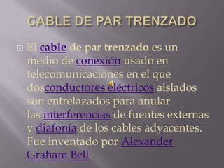El cable de par trenzado es un medio de conexión inventado por Alexander Graham Bell que entrelaza dos conductores eléctricos aislados para reducir interferencias. Existen diferentes tipos como el par trenzado sin blindaje, de bajo costo pero con más errores; el par trenzado blindado con cubierta protectora utilizado en redes Ethernet; y el par trenzado con blindaje global con mejor protección frente a interferencias.