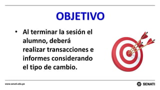 El documento proporciona información sobre el tipo de cambio y los mercados de divisas. Explica que el tipo de cambio se refiere al precio de una moneda en términos de otra y depende de la oferta y demanda en el mercado de divisas. Identifica a los bancos centrales, empresas, bancos y especuladores como los principales participantes en este mercado. Además, distingue entre los segmentos del mercado de divisas spot y a plazo.