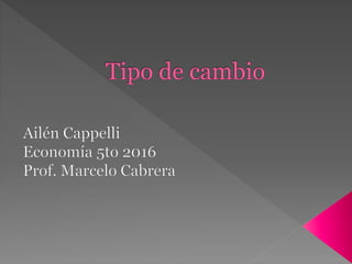 El documento describe el tipo de cambio y cómo se determina. El tipo de cambio es la cantidad de moneda nacional necesaria para comprar moneda extranjera. Generalmente se rige por la oferta y la demanda de cada divisa en la mayoría de los países, lo que hace que varíe constantemente. Algunos bancos centrales también influyen en el tipo de cambio para mantener la estabilidad económica.