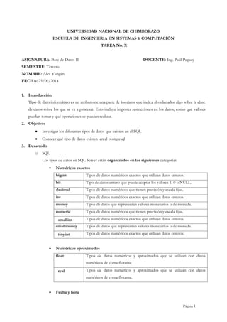 Este documento describe los tipos de datos en SQL y PostgreSQL. Explica que un tipo de dato es un atributo que indica el tipo de información que puede almacenar un objeto, como enteros, cadenas, fechas, etc. Luego lista las categorías y ejemplos de tipos de datos en SQL, como numéricos exactos, fechas y horas. Finalmente, resume los tipos de datos más comunes en PostgreSQL, como enteros, decimales, fechas e IP addresses.