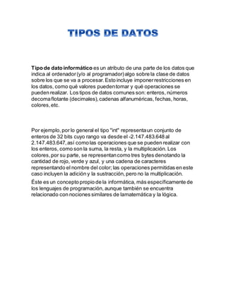 Los tipos de datos definen conjuntos de valores y operaciones sobre esos valores. Algunos tipos comunes son enteros, números de punto flotante, cadenas, fechas y colores. Los tipos de datos imponen restricciones sobre los valores que pueden almacenarse y las operaciones permitidas. Por ejemplo, el tipo "int" representa enteros de 32 bits con operaciones como suma y multiplicación, mientras que los colores se representan como bytes de color y cadenas de nombres con operaciones de adición y sustracción.