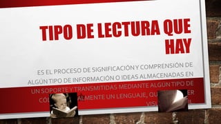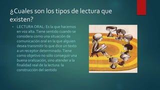 Este documento describe los diferentes tipos de lectura. Identifica la lectura oral, la lectura silenciosa, y varios tipos de lectura basados en la velocidad y objetivos, incluyendo lectura rápida y superficial, extensiva e intensiva, involuntaria, integral, selectiva, reflexiva y atenta.