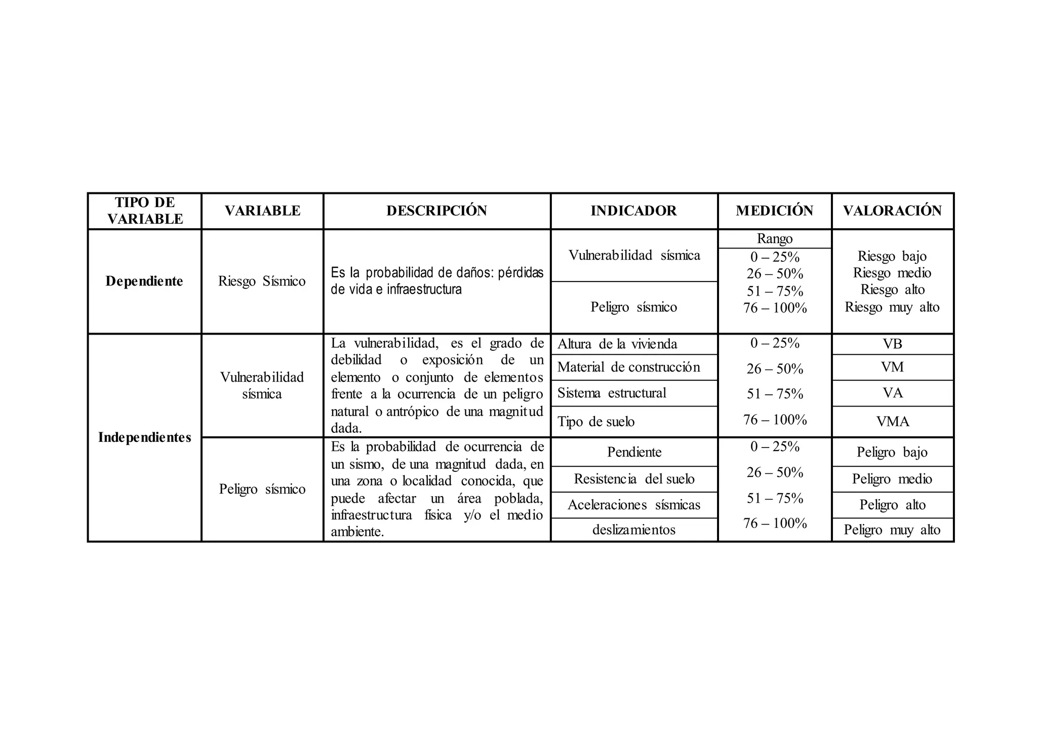 Este documento describe variables relacionadas con el riesgo sísmico. La variable dependiente es el riesgo sísmico, medido por la probabilidad de daños. Las variables independientes que afectan la vulnerabilidad sísmica son la altura de la vivienda, el material de construcción, el sistema estructural y el tipo de suelo. Otras variables independientes son el peligro sísmico, medido por la probabilidad de ocurrencia de sismos y factores como la pendiente, la resistencia del suelo y las aceleraciones sísmicas.
