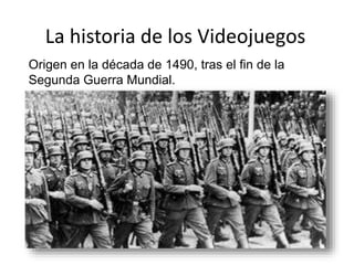 Este documento describe los orígenes y tipos principales de videojuegos. Los videojuegos surgieron en la década de 1940 después de la Segunda Guerra Mundial, con el desarrollo de máquinas como ENIAC en 1946. El documento luego enumera y brevemente describe varios géneros populares de videojuegos, incluidos arcade, aventura, deportivos, simulación, estrategia, rol, disparos, beat 'em up, sigilo, shoot 'em up y plataforma.