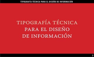 El documento habla sobre la tipografía técnica para el diseño de información. Explica cuatro aspectos de la tipografía técnica, incluyendo su aplicación en matemáticas, la narración infográfica, el diseño tipográfico y el diseñador como mediador. También describe elementos como números, unidades, símbolos y fórmulas matemáticas, y cómo la infografía puede hacer que los datos sean más comprensibles.