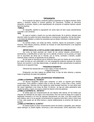 La tipografía se refiere a los signos y símbolos gráficos utilizados en la impresión. Incluye letras, números, puntuación y espacios. La familia tipográfica agrupa tipos de letra con características similares. La legibilidad de un texto depende de factores como el diseño de la letra, el espaciado entre letras y líneas, el tamaño de la letra y la longitud de línea. La rotulación es importante para la comunicación y puede expresar ideas a través de la forma y tamaño de las le