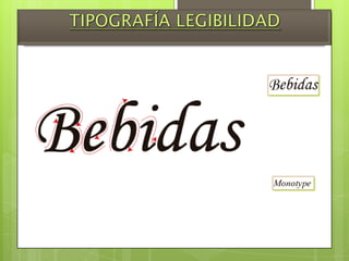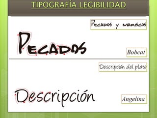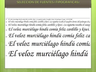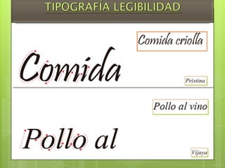 El documento presenta un análisis tipográfico para un proyecto ilustrador realizado por Osores Alcocer y Kevin para la clase de Diseño Publicitario III. Incluye información sobre modelos tipográficos, legibilidad y contraste tipográfico, con detalles sobre las fuentes Calisto MT y Pristina utilizadas en diferentes tamaños para el título, subtítulos y texto de una descripción de un plato de comida criolla.