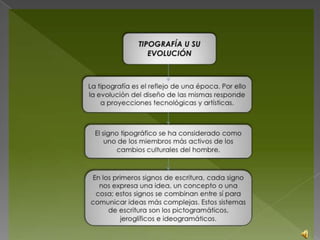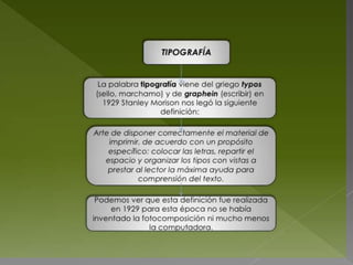 La tipografía es el arte y técnica de disponer letras, espacios y texto de forma que facilite la comprensión del lector. Incluye microtipografía, que se enfoca en detalles como letras, espacios entre letras y palabras, e interlineado, y macrotipografía, que considera el tipo, estilo y tamaño de letra. La tipografía creativa usa el texto como metáfora visual.