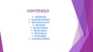 Este documento presenta diferentes tipologías de redes informáticas, incluyendo punto a punto, bus, estrella, anillo, malla, árbol y topología híbrida. Define una red informática como un conjunto de dispositivos que comparten recursos e interactúan como emisores y receptores. Explica cada tipología con ejemplos e imágenes ilustrativas.