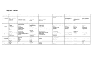 Este documento describe los diferentes tipos de textos desde varias perspectivas. Identifica aspectos como la intención comunicativa, los modelos, los elementos lingüísticos, la estructura y los registros de los tipos textuales descriptivos, narrativos, conversacionales, instructivos, predictivos, explicativos, argumentativos y retóricos. Explica brevemente las características fundamentales de cada uno de estos tipos de textos.