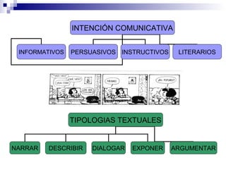 Este documento presenta una tabla que resume los diferentes tipos de textos, sus intenciones comunicativas, tipologías y ejemplos. Explica que existen textos informativos, persuasivos, instructivos y literarios. Dentro de cada categoría, describe brevemente las funciones de cada texto como narrar, describir, dialogar o exponer. Además, incluye ejemplos cortos de diferentes géneros como noticia, receta, poema y novela.