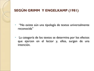 Este documento describe tres tipos principales de textos: descriptivo, argumentativo y expositivo-explicativo. Para cada tipo, describe sus características, intención comunicativa, géneros discursivos comunes, aspectos lingüísticos y estructura. El texto descriptivo tiene la intención de describir cómo es algo, el argumentativo busca convencer una posición, y el expositivo-explicativo explica un tema de manera objetiva para permitir la comprensión.