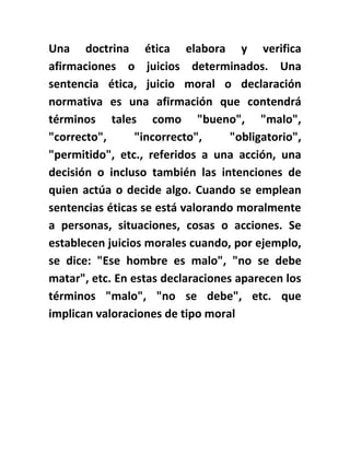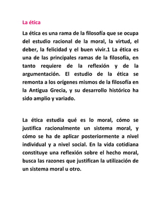 Este documento trata sobre varios temas relacionados con la ética y la moral. Explica que la ética es la rama de la filosofía que estudia conceptos como la moral, la virtud y el deber. También define la moral como las reglas que rigen la conducta humana y analiza conceptos como los valores, los deberes y los derechos.