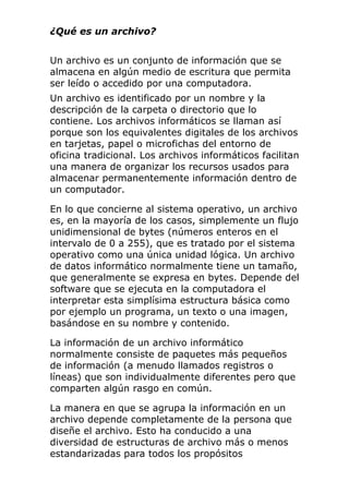 Este documento describe diferentes tipos de archivos digitales, incluyendo archivos de texto, imágenes, video, audio y compresión. Explica qué es un archivo en general, las extensiones de archivo, y proporciona detalles sobre formatos populares de archivos para cada tipo, como .txt para archivos de texto, .jpg y .png para imágenes, .avi y .mp4 para video, y .mp3 para audio.