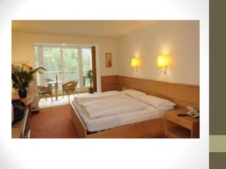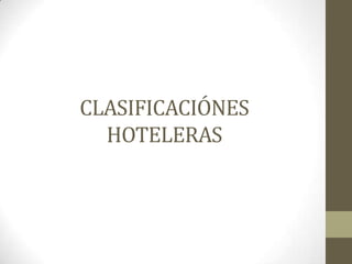 Este documento clasifica y describe diferentes tipos de hospedajes. Los divide en cuatro clasificaciones principales: hoteles comerciales, de vacaciones, residenciales y moteles. Luego describe cada categoría de hoteles de 1 a 5 estrellas, así como también habitaciones privadas, casas de huéspedes, pensiones, hoteles Garin, botels y residencias vacacionales.