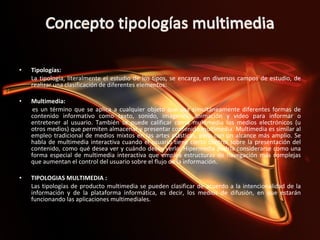 El documento clasifica las tipologías de productos multimedia según su intencionalidad y plataforma de difusión. Identifica cuatro tipos principales: multimedia comercial, que ayuda a localizar clientes y planificar ventas; multimedia publicitaria, que promueve productos a través de medios como páginas web y catálogos; multimedia informativa, que difunde noticias en páginas web; y multimedia educativa, que motiva el aprendizaje a través de contenidos interactivos en plataformas online y offline.