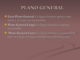 Este documento describe diferentes tipos de planos utilizados en fotografía y cine, incluyendo planos generales que muestran figuras humanas a distancia, planos enteros y de cintura para arriba, primeros planos desde los hombros hasta la cabeza, y primerísimos primeros planos muy cercanos de la cara, así como planos conjuntos con múltiples personas y planos de detalle de una parte del cuerpo.