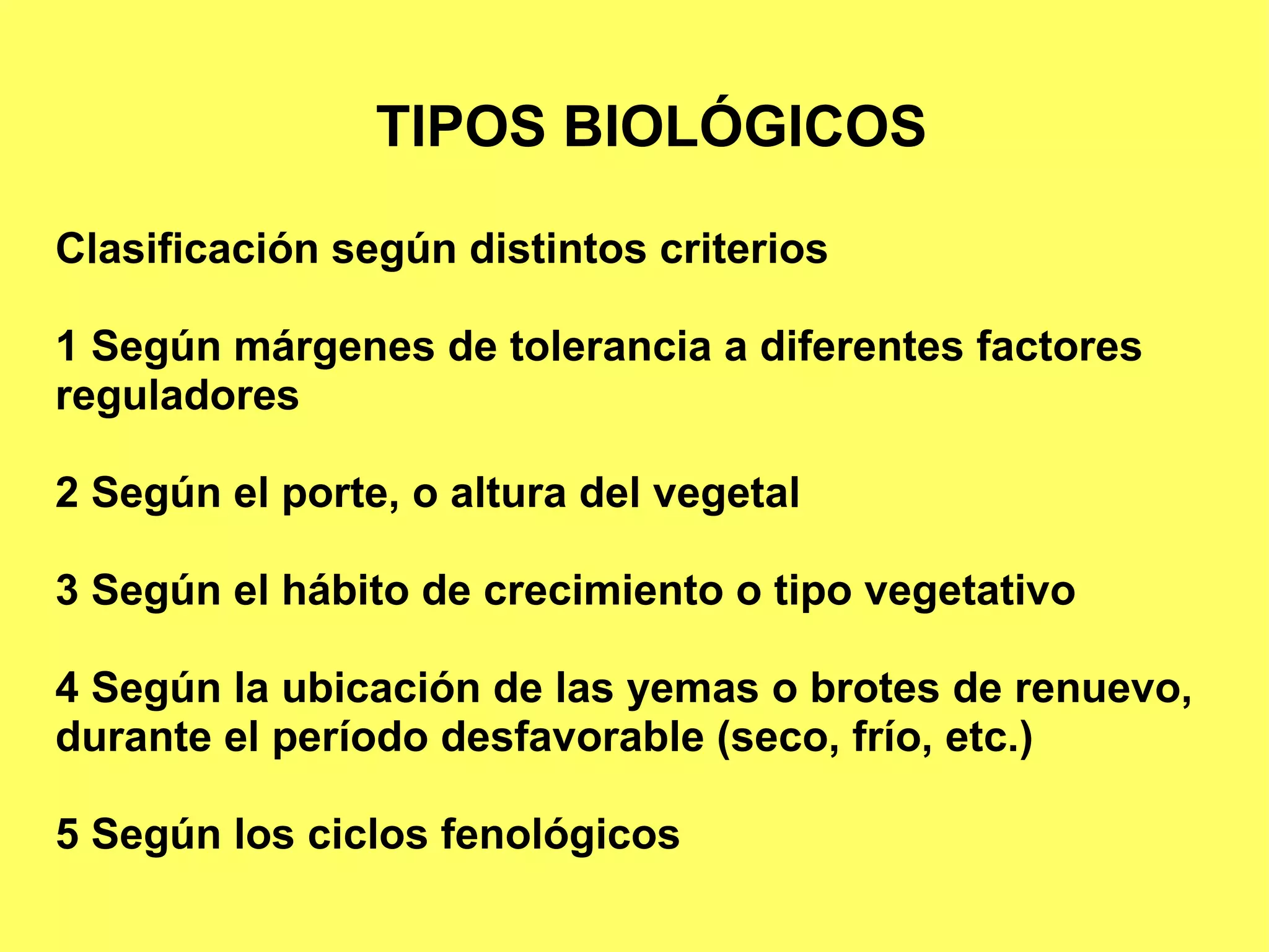 El documento clasifica los tipos biológicos de plantas según cinco criterios: 1) Tolerancia a factores reguladores como el agua, 2) Porte o altura, 3) Hábito de crecimiento, 4) Ubicación de yemas durante períodos desfavorables, y 5) Ciclos fenológicos. Explica cada criterio con ejemplos de plantas y provee información adicional sobre la fenología, el estudio de eventos periódicos en la vida de las plantas y su relación con el clima.