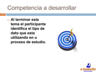 Este documento describe los diferentes tipos de datos que se pueden encontrar en estadística. Explica que los datos pueden ser cualitativos o cuantitativos. Los datos cualitativos no son numéricos y pueden ser nominales u ordinales. Los datos cuantitativos son numéricos y pueden ser discretos o continuos. Además, los datos cuantitativos se dividen en datos de razón e intervalo.