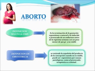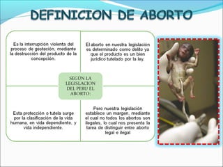 Este documento contiene información sobre el aborto desde diferentes perspectivas médicas, legales y de derechos humanos. Define el aborto según la OMS, la obstetricia y la medicina legal, e incluye secciones sobre cómo reconocer un aborto espontáneo versus uno provocado, posibles instrumentos para realizar un aborto, y el diagnóstico médico-legal. También cubre aspectos legales como los códigos penales peruanos relacionados con el aborto y documentos internacionales de derechos humanos.
