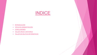 Este documento presenta diferentes tipos de administración como la administración financiera, pública, internacional, de empresas, comparativa, por objetivos y de negocios. Explica brevemente cada tipo y concluye que la planificación y organización integrada entre las áreas es importante para que una empresa tenga objetivos claros y opere de manera efectiva.