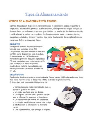 Los sistemas informáticos pueden almacenar datos internamente (en la memoria) o externamente (en dispositivos de almacenamiento). Estos dispositivos clasifican la información de forma permanente o temporal según su tecnología electrónica u óptica, y pueden acceder a los datos de forma aleatoria o secuencial. Existen diversos tipos como memorias, dispositivos magnéticos, ópticos y extraíbles.
