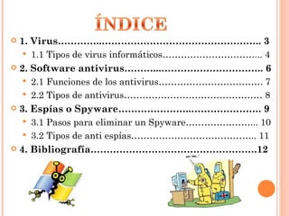 Este documento habla sobre los virus informáticos, software antivirus y spyware. Explica los diferentes tipos de virus como virus de macros, boot y residentes. Luego describe las funciones principales de los antivirus como detección, vacunación y eliminación de virus. Finalmente, detalla algunos tipos comunes de spyware y anti spyware como Spybot Search & Destroy y SpywareBlaster.