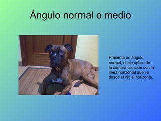 El documento describe diferentes tipos de ángulos de cámara, incluyendo el ángulo normal donde la cámara está alineada horizontalmente con el horizonte, el ángulo picado donde la cámara está situada desde arriba apuntando hacia abajo, el ángulo contrapicado donde la cámara mira hacia arriba desde abajo, el ángulo imposible donde la cámara está dentro de una caja, y el ángulo gusano donde la cámara está instalada a ras de suelo.
