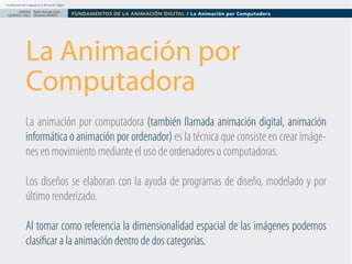 Este documento describe los fundamentos de la animación digital, incluyendo los tipos de animación 2D y 3D, las técnicas tradicionales como dibujos animados y stop motion, y el papel de la computadora en la creación y representación de la animación. También explica conceptos como fotogramas, frecuencia de fotogramas y diferentes formatos para animación digital.