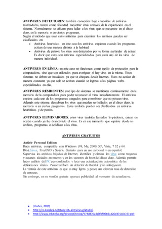 Los antivirus son programas cuyo objetivo es detectar y eliminar virus informáticos. Se clasifican en preventores, identificadores y descontaminadores. También incluyen cortafuegos, antiespías, antispam y detectores. Existen versiones gratuitas como Avast, AVG y Microsoft Security Essentials, y versiones pagadas como Norton Antivirus.