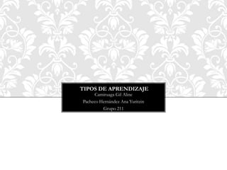 El documento describe 5 tipos de aprendizaje: visual, auditivo, por descubrimiento, receptivo y significativo. El aprendizaje visual se da a través de ver cosas, el auditivo al escuchar explicaciones, el de descubrimiento cuando el estudiante investiga por su cuenta, el receptivo cuando el estudiante recibe pasivamente la información, y el significativo cuando el estudiante integra nueva información con sus conocimientos previos.