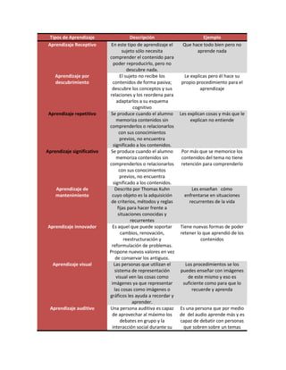 El documento describe diferentes tipos de aprendizaje, incluyendo el aprendizaje receptivo, por descubrimiento, repetitivo, significativo, de mantenimiento, innovador, visual y auditivo. El aprendizaje receptivo implica comprender pero no descubrir, el aprendizaje por descubrimiento implica que el sujeto descubre conceptos y relaciones de forma activa, y el aprendizaje repetitivo implica memorizar sin comprender.
