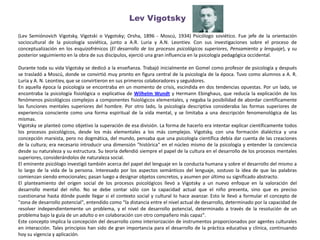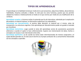 El documento aborda diferentes tipos de aprendizaje, incluyendo el receptivo, por descubrimiento, memorístico y significativo, resaltando la importancia de la adaptación cognitiva en los humanos. Se destacan las contribuciones de figuras como Lev Vigotsky, Jean Piaget y David Ausubel en la psicología y pedagogía, cada uno ofreciendo perspectivas sobre el desarrollo cognitivo y los procesos de aprendizaje. Además, se expone la evolución del lenguaje, la memoria, la atención, la percepción y la inteligencia, enfatizando el papel de la cultura y el entorno en el desarrollo mental.