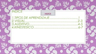 Este documento describe tres tipos principales de aprendizaje: visual, auditivo y kinestésico. El aprendizaje visual utiliza organizadores gráficos como mapas conceptuales. El aprendizaje auditivo se dirige a estudiantes que aprenden mejor escuchando. El aprendizaje kinestésico involucra sensaciones y movimiento del cuerpo para procesar información.