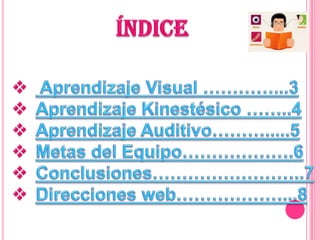 Este documento describe tres tipos de aprendizaje: aprendizaje visual, kinestésico y auditivo. El aprendizaje visual utiliza organizadores gráficos como mapas conceptuales y diagramas para ayudar a los estudiantes a pensar y aprender de manera más efectiva. El aprendizaje kinestésico involucra procesar información asociándola con sensaciones y movimientos corporales. El aprendizaje auditivo depende de escuchar y hablar como principales formas de adquirir conocimiento.