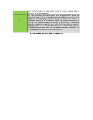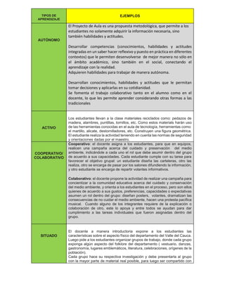 Este documento describe diferentes tipos de aprendizaje, incluyendo aprendizaje autónomo, activo, cooperativo/colaborativo, situado y 1:1. El aprendizaje autónomo permite a los estudiantes adquirir habilidades y actitudes además de información. El aprendizaje activo involucra a los estudiantes construyendo figuras geométricas con materiales de desecho. El aprendizaje cooperativo/colaborativo implica a los estudiantes trabajando en equipos o grupos para completar proyectos. El aprendizaje