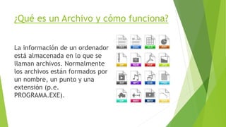 Este documento explica qué son los archivos y cómo funcionan, incluyendo diferentes tipos de archivos como ejecutables, de datos, de audio, imágenes, video y comprimidos. También describe cómo mostrar u ocultar extensiones de archivos y criterios de búsqueda usando comodines como el asterisco y el signo de interrogación.