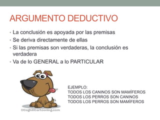 Este documento describe diferentes tipos de argumentos, incluyendo argumentos deductivos e inductivos. Los argumentos deductivos derivan una conclusión necesariamente verdadera de premisas verdaderas, mientras que los argumentos inductivos establecen conclusiones probables pero no necesariamente verdaderas. Se explican varios tipos específicos de argumentos deductivos como silogismos y reducciones al absurdo, así como inductivos como estadísticos, analógicos y de autoridad.