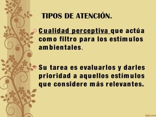 Este documento describe los diferentes tipos de atención según la clasificación de Ballesteros. Identifica la atención interna y externa dependiendo del origen de los estímulos, la atención voluntaria e involuntaria según el control del sujeto, la atención abierta y encubierta de acuerdo a las respuestas motoras, y la atención dividida y selectiva basada en la cantidad de estímulos. También distingue la atención visual/espacial de la auditiva/temporal dependiendo de la modalidad sensorial.